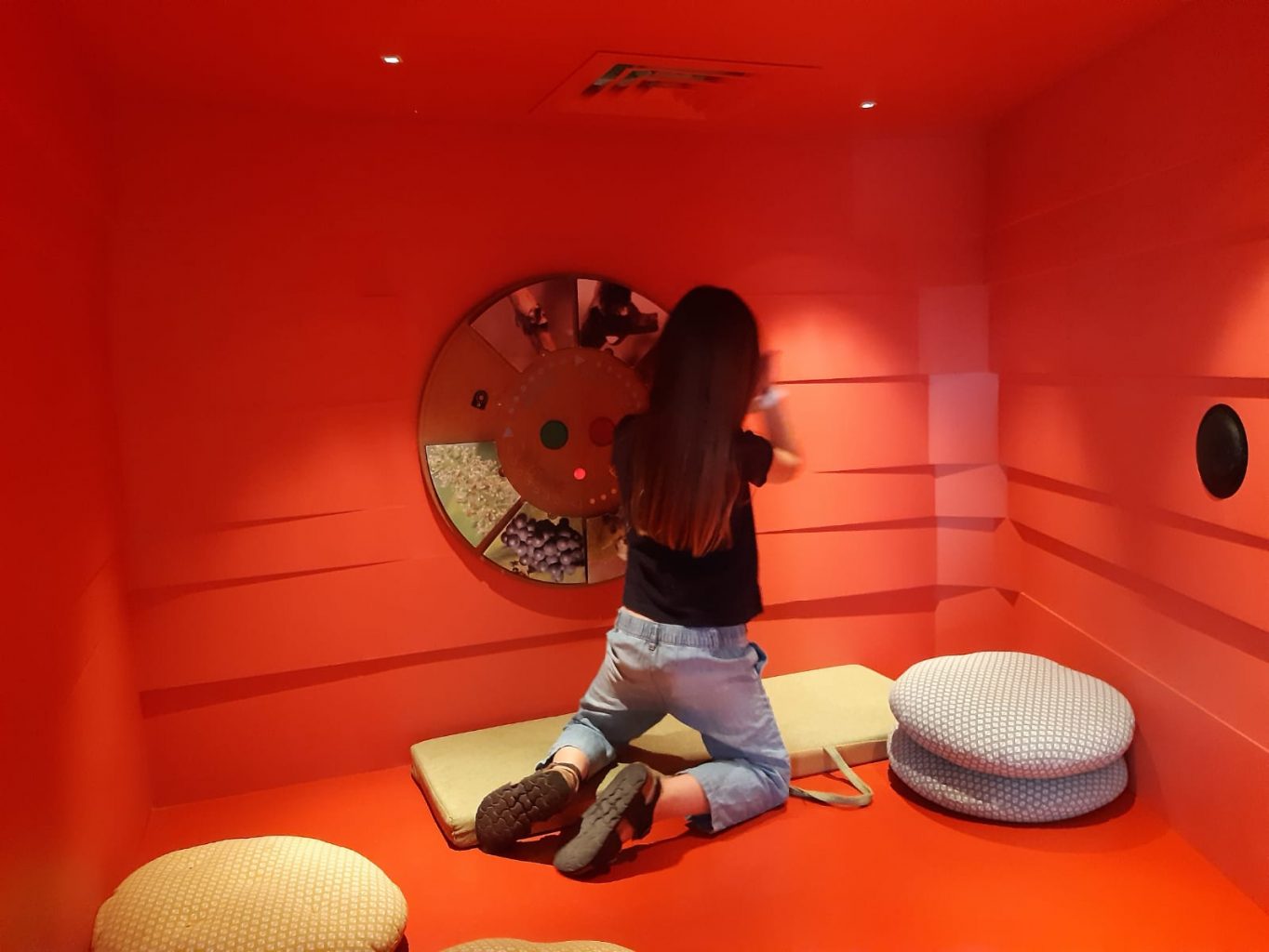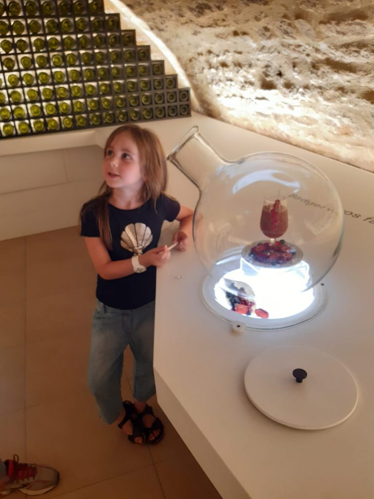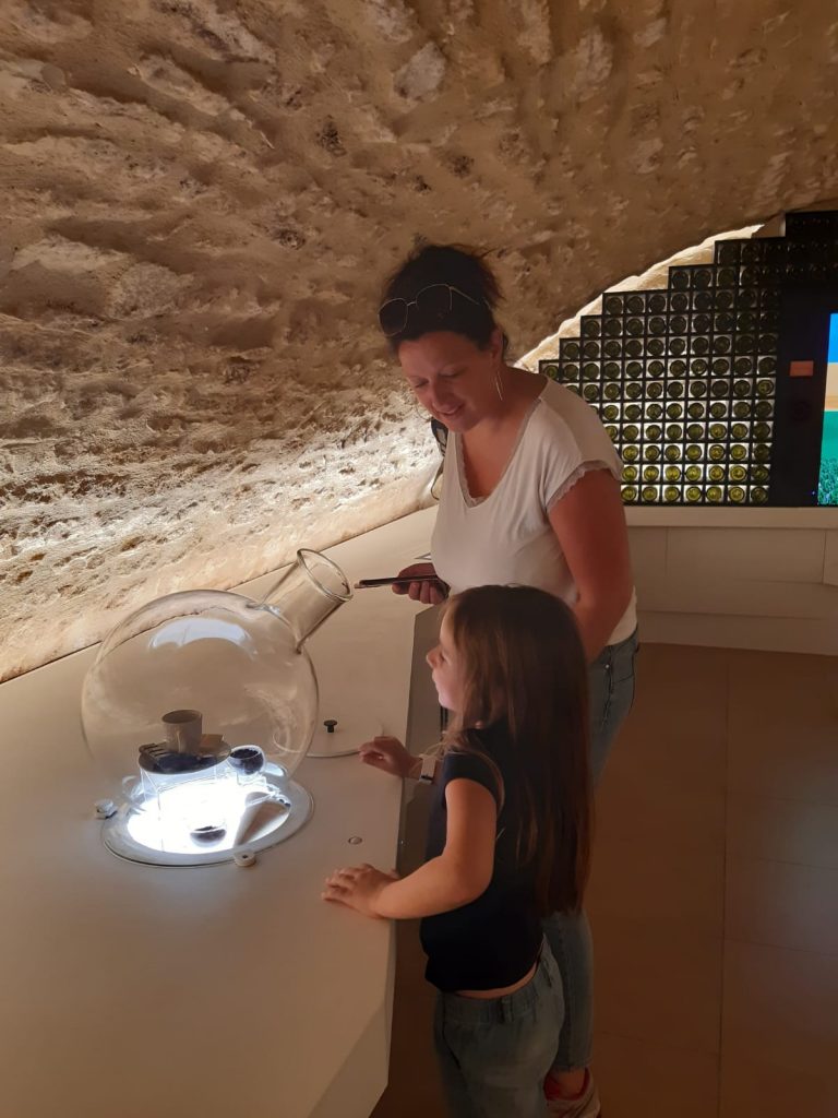 Ces petits abris où se réfugient les vignerons en cas de pluie, sont ici truffés de jeux pour enfants. Gros succès aussi côté senteurs, elle va beaucoup s’appliquer à humer les différents bouquets de famille de vins. Munie d’un bracelet elle clique sur un point pour écouter des histoires à dormir debout dans un univers high tech comme son siècle. A la fin du parcours, une dégustation de vin pour les grands, et jus  pour les petits en guise de cerise sur la vigne !