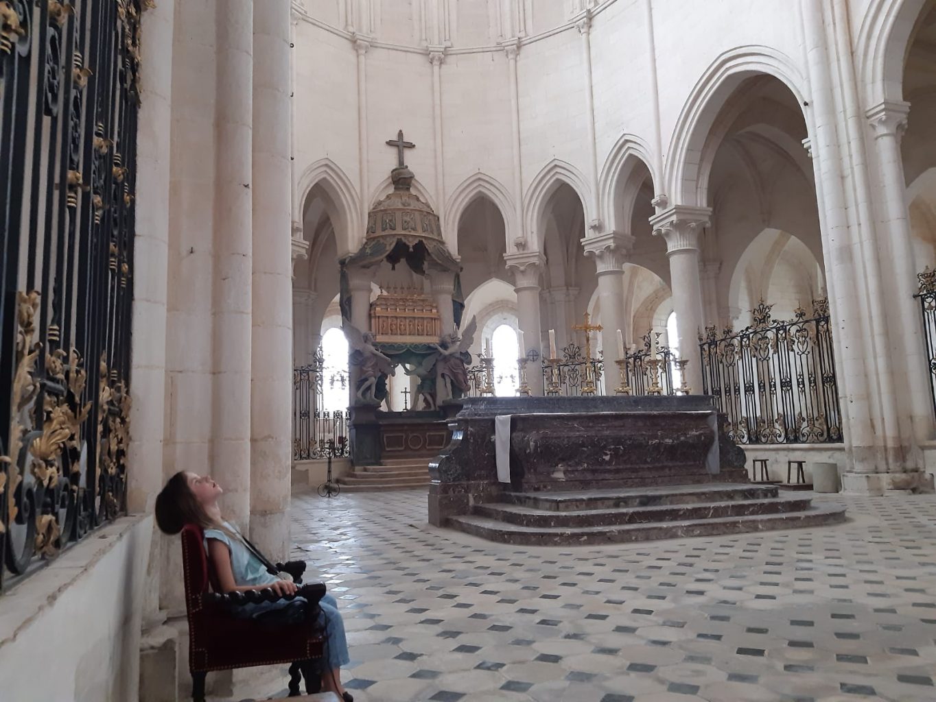 La scénographie immersive est très réussie mais s’adresse pour l’instant aux adultes. Il n’empêche que  le casque donné à l’entrée plonge petits et grands dans un univers de sons en 3 D, les chants et choeurs vont compenser le narratif un peu pointu. Et capter l’attention de junior, qui contemplera aux anges, les stalles de  abbaye et leur profusion de fleurs et fruits et de grappes de raisin sculptées dans le bois.