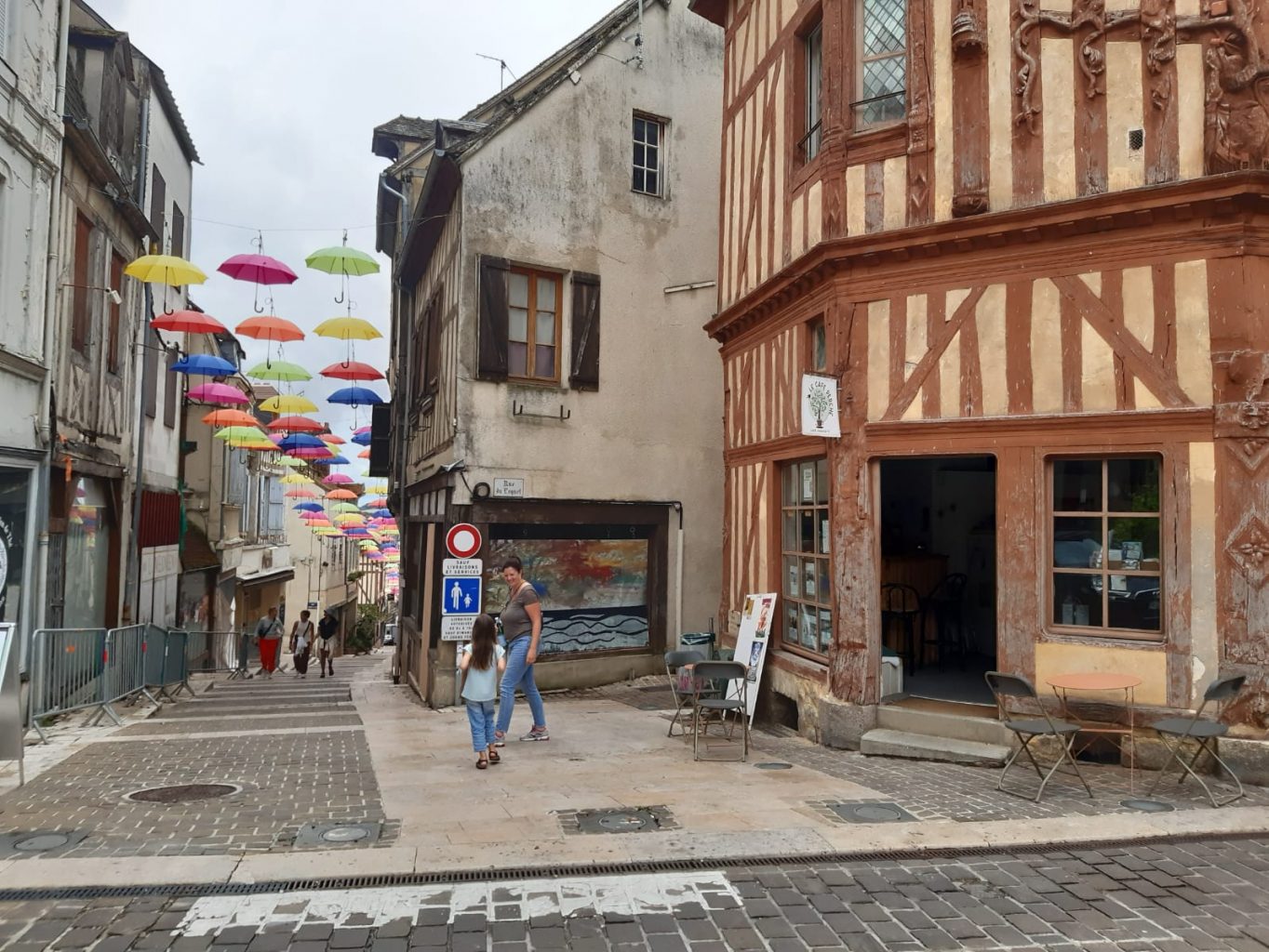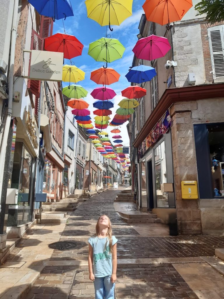 Etape suivante: Joigny la cité décorée de parapluies multicolores dans sa principale rue pietonne ravit junior. On déjeune chez Vega’ Nath qui loin d’ être une intégriste végan offre aussi des hot dogs au menu enfant et du sirop de violette, une grande découverte pour junior et des prix tout doux dans un cadre spacieux, sympa et chaleureux.