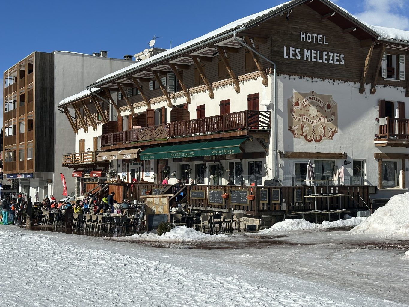 pizzeria, brasserie avec sa terrasse ensoleillée sur la place du village et au pieds des pistes
