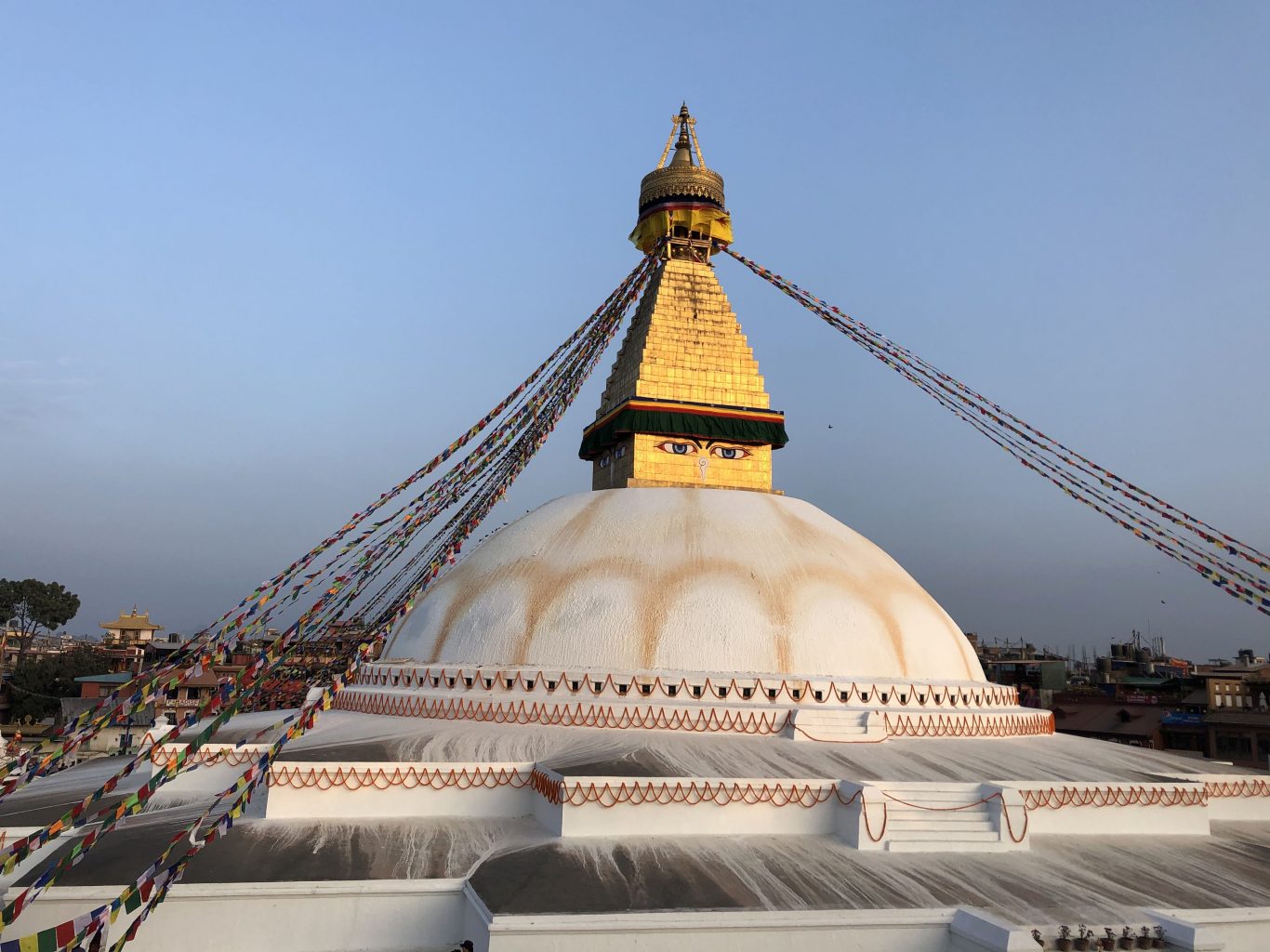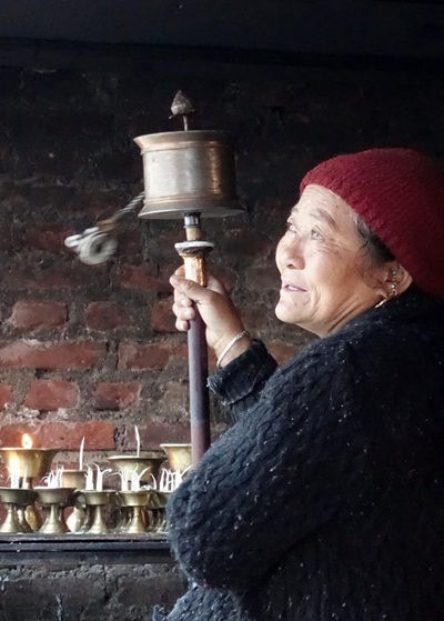 Deux yeux bleus qui semblent fixer l’horizon, une énorme construction circulaire blanche, et une foule silencieuse qui tourne inlassablement autour… Bodnath ne peut pas laisser indifférent. Le Stupa est un monument religieux de forme hémisphérique, destiné à abriter des reliques de Bouddha. Tout autour de celui de Bodnath, un ensemble de moulins à prières que l’on actionne en marchant force le pèlerin à concentrer son attention sur son cheminement en récitant le « om mani padmé hûm ». De nombreux monastères, écoles bouddhistes ou échoppes en tous genres se nichent tout autour, dans les ruelles étroites et animées.