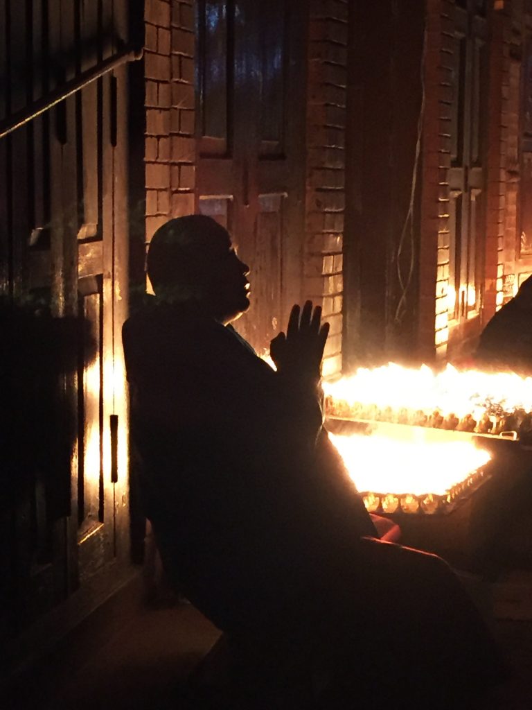 A quelques ruelles de là s’étend Durbar Square: un étonnant enchevêtrement de temples dans lequel se glissent des deux roues de toutes sortes, des rickshaws, et quelques véhicules téméraires. Même si le site porte les traces visibles du séisme de 2015, l’ensemble dégage une majesté indéniable et nombre de détails, sur les monuments, les murs ou les toits, illustrent ce curieux mélange entre bouddhisme et hindouisme que l’on trouve en particulier au Népal. En face du Palais Royal se trouve la demeure de la Kumari, jeune fille pré pubère, choisie et vénérée comme une déesse vivante, de ses 5 ans à ses premières règles. Au cours de ces années elle ne sort que pour participer à des cérémonies. Cette très ancienne tradition est encore très vive, le roi du Népal lui-même venant s’incliner chaque année devant la Kumari royale.