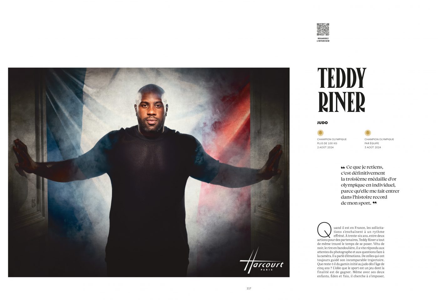Avant de rentrer dans le vif du sujet de cet ouvrage de grande qualité ou les cinquante champions ont pris la pose pour un double page devant l’objectif du Studio Harcourt et sont classés par ordre alphabétique de la judokate Clarisse Agbégnénou à l’archer Jean-Charles Valladont, en passant notamment par la joueuse de boccia Aurélie Aubert, la handballeuse Cléopâtre Darleux, le judoka Teddy Riner, le nageur Léo Marchand, le judoka Teddy Riner, il est important de lire deux écrits de valeur.